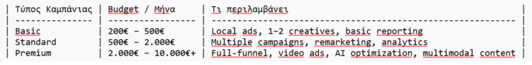 • CPM (Cost per 1.000 Impressions): Τι πληρώνεις για 1.000 εμφανίσεις. Από 5€ σε low-competition κλάδους μέχρι 50€+ σε premium segments.